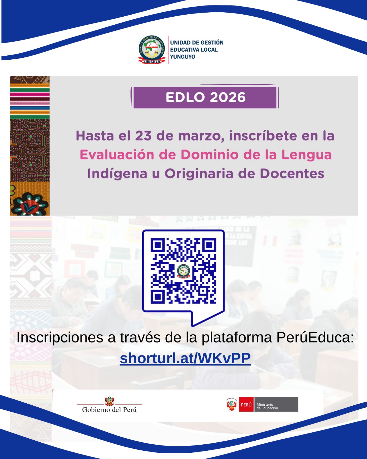 Descripción:SE COMUNICA A LOS DOCENTES INTERESADOS EN LAS INSCRIPCIÓN A LA EVALUACION DE LENGUAS ORIGINARIAS EL SIGUIENTE DETALLE: